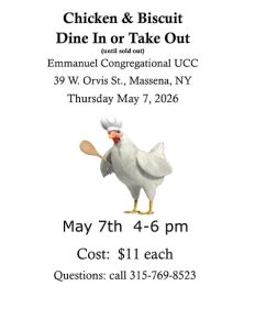 Chicken & Biscuit Dinner Emmanuel Congregational UCC is hosting a chicken and biscuit dinner on Thursday May 7th from 4-6pm. Cost is $11/dinner with dine in or take out option. Location is 39 West Orvis St. Massena, NY